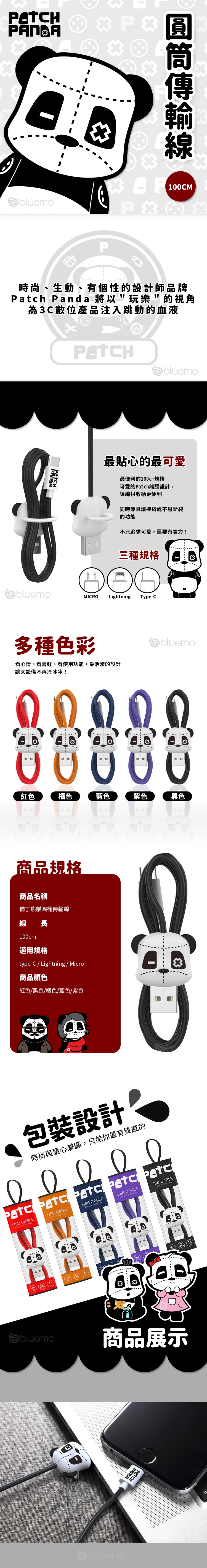 Bluemo 補丁熊貓 禮物圓桶 100cm 傳輸/充電線-黑色【Micro】