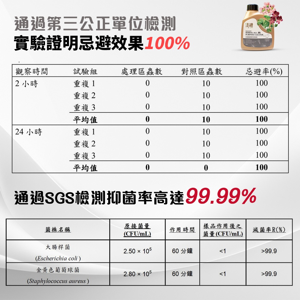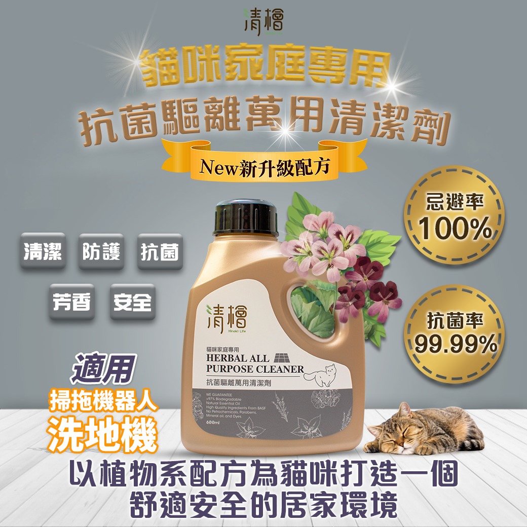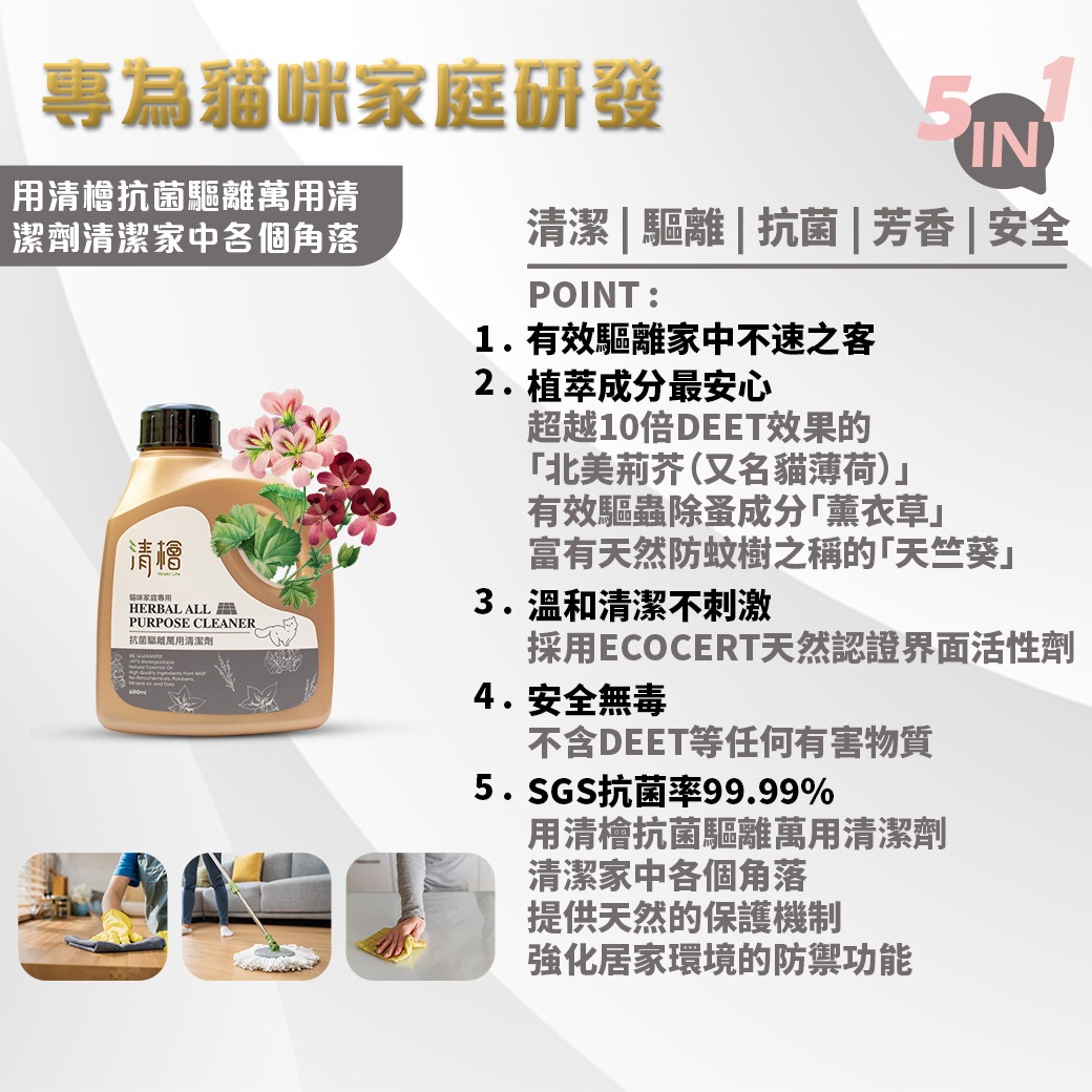 🔹清潔、驅離、抗菌、芳香、安全 5in1。🔹用清檜抗菌驅離萬用清潔劑清潔家中各個角落。提供天然的保護機制,強化居家環境的防禦功能。🔹通過第三公正單位檢測,忌避率效果100%。🔹植萃成分最安心-超越10倍DEET效果的「北美荊芥(又名貓薄荷)」、「天竺葵」以及Ecocert天然認證界面活性劑,擦拭清潔地板、桌面、流理臺、洗手台、櫃子、廚房水槽、傢俱等地方,讓您擁有舒適光亮的潔淨空間。🔹安全無毒-不含DEET等任何有害物質。🔹SGS抗菌率99.99%,無需再用清水擦拭。
