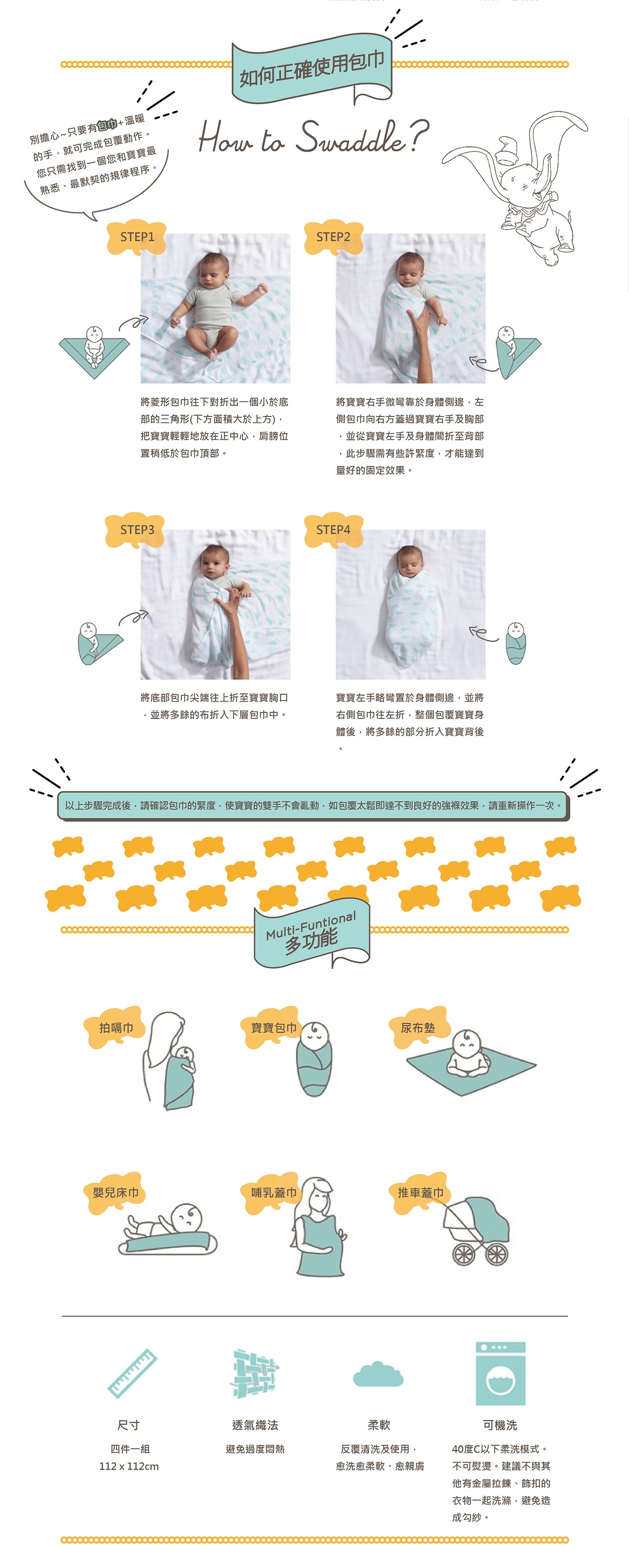 •萬用方型大尺寸:可當包巾、拍嗝巾、蓋毯、尿布墊、嬰兒床巾、推車蓋巾、哺乳罩巾,商品尺寸112*112公分