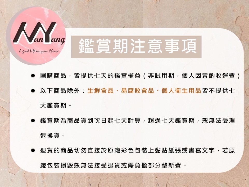 - 食品、個人衛生用品(如按摩器、眼部按摩器....等屬於貼身用品) 不適用退換貨。依消費者保護法第19條及行政院消費者保護處公告,買家可接受子條款再進行購買,以維護您的權益,煩請三思後下單。