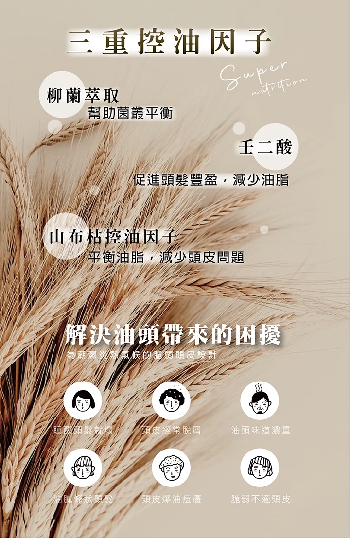 柳蘭萃取液 調節油性頭皮的皮脂產生,維持健康不油膩的頭皮及秀髮。維持頭皮肌膚菌叢平衡。
