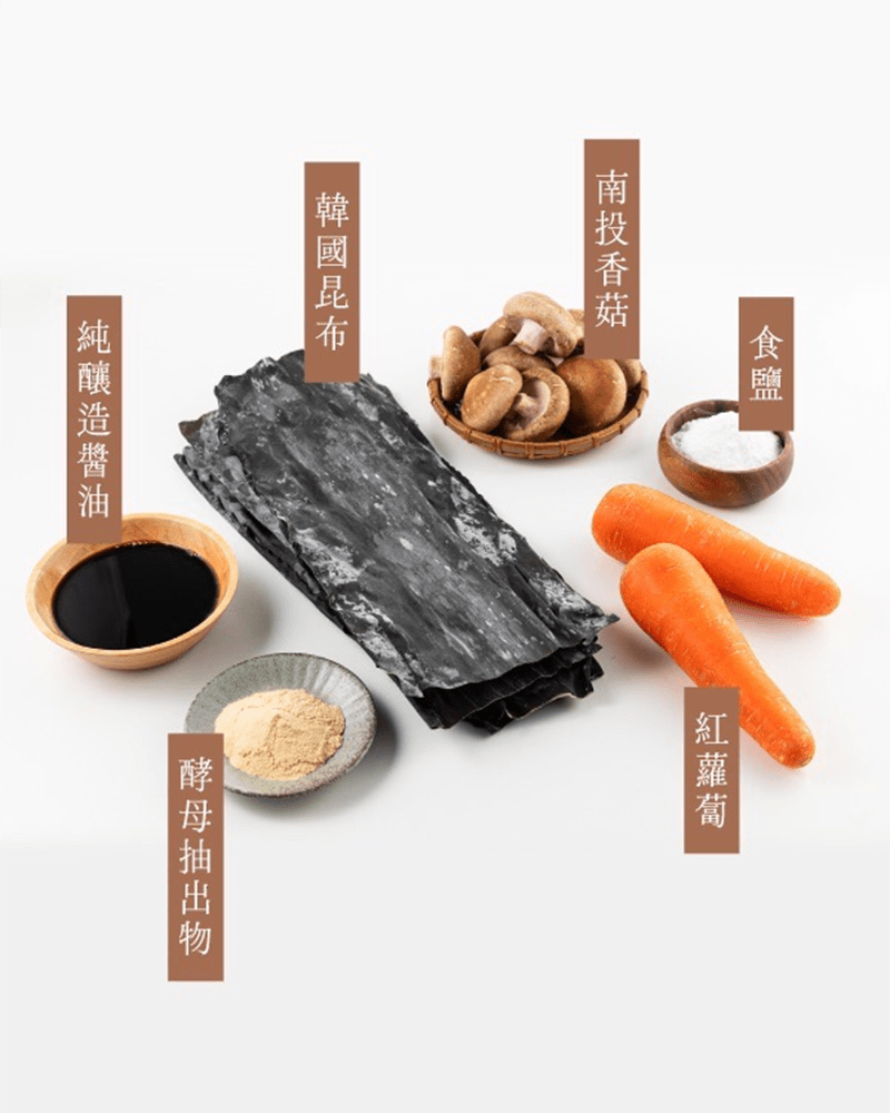 成分:昆布.乾燥番茄.乾燥香菇.純釀造醬油(水.黑豆.黃豆.小麥.食鹽.糖.甘草).酵母抽出物.食鹽.麥芽糊精。