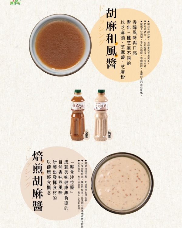 ★用芝麻油、芝麻醬、芝麻粉,帶出三種芝麻不同的香醇風味與口感。