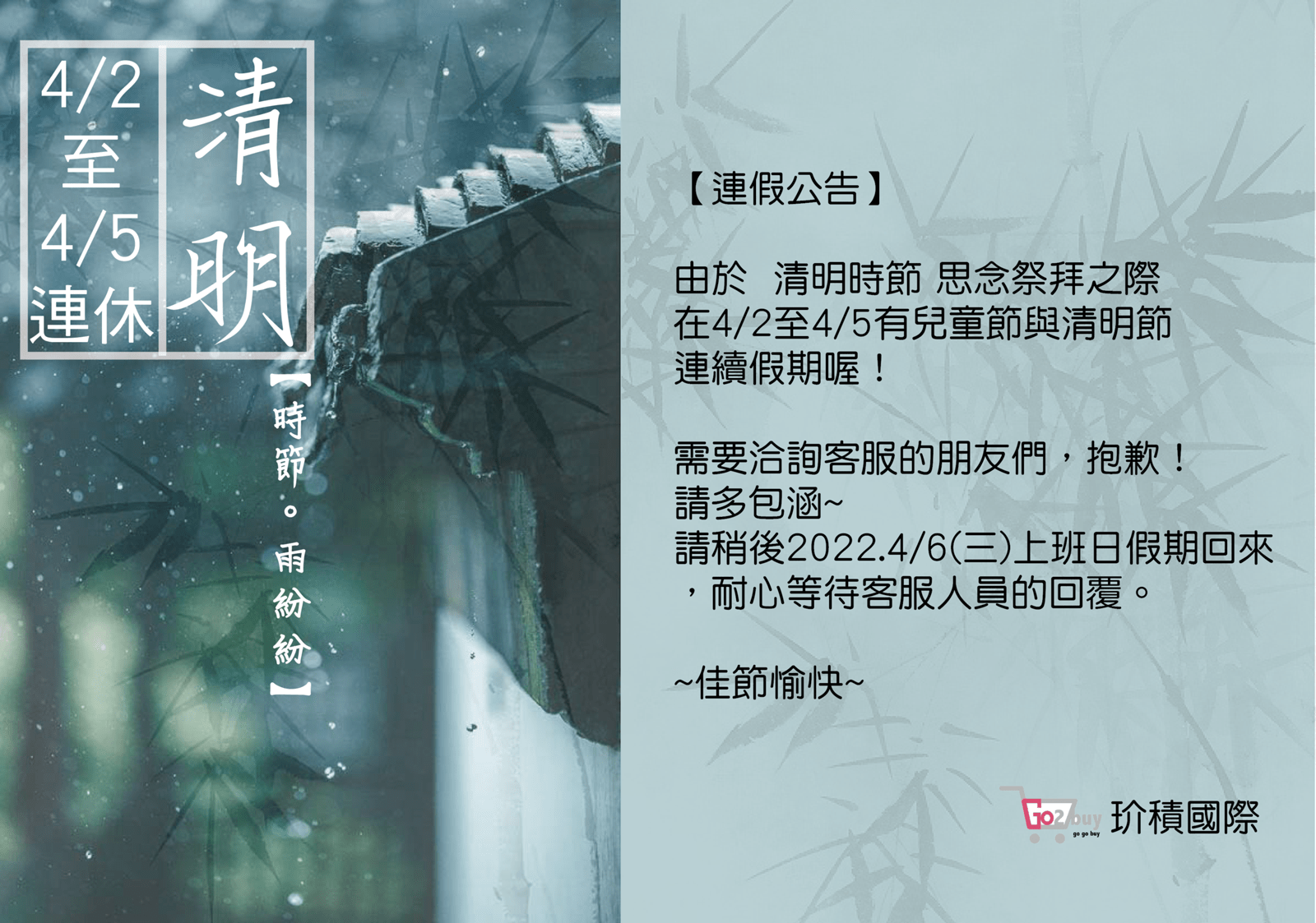 【連假公告】清明連假~客服服務將在4/2-4/5暫停服務,請多包涵~